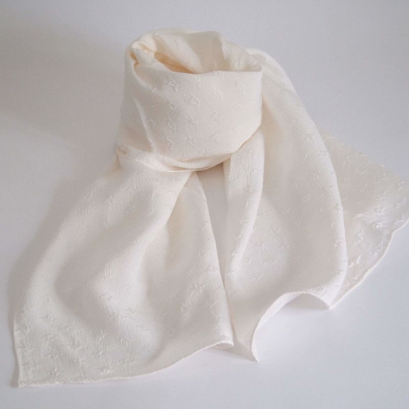 C’est un foulard en soie vierge à teindre, tissé au Japon. La technique de tissage s’appelle “Fukure Ori”. Il est utilisé pour le kimono traditionnel dans lequel les motifs sont tissés jacquard puis rétrécis afin de donner un caractère tridimensionnel prononcé au matelassé. Ce tissage particulier donne un effet “Elastique” qui fait croire qu’il y a des matières synthétiques mais non ! Entièrement en soie. Ces motifs sont vus souvent sur les Obi. Ce foulard tissé en Fukuré Ori est rare et précieux. Votre foulard teint sera très original et unique.