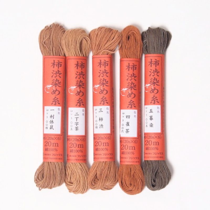 Les fils à broder teints en kakishibu sont disponibles en 5 couleurs différentes. Lorsqu’un objet est réalisé en teinture végétale, il est regrettable d’y ajouter des fils teintés avec des colorants non végétaux. Avec ces fils, vous pouvez créer des ouvrages entièrement teintés de manière naturelle. Ils sont parfaits pour la couture à la main, le sashiko et bien d’autres techniques.