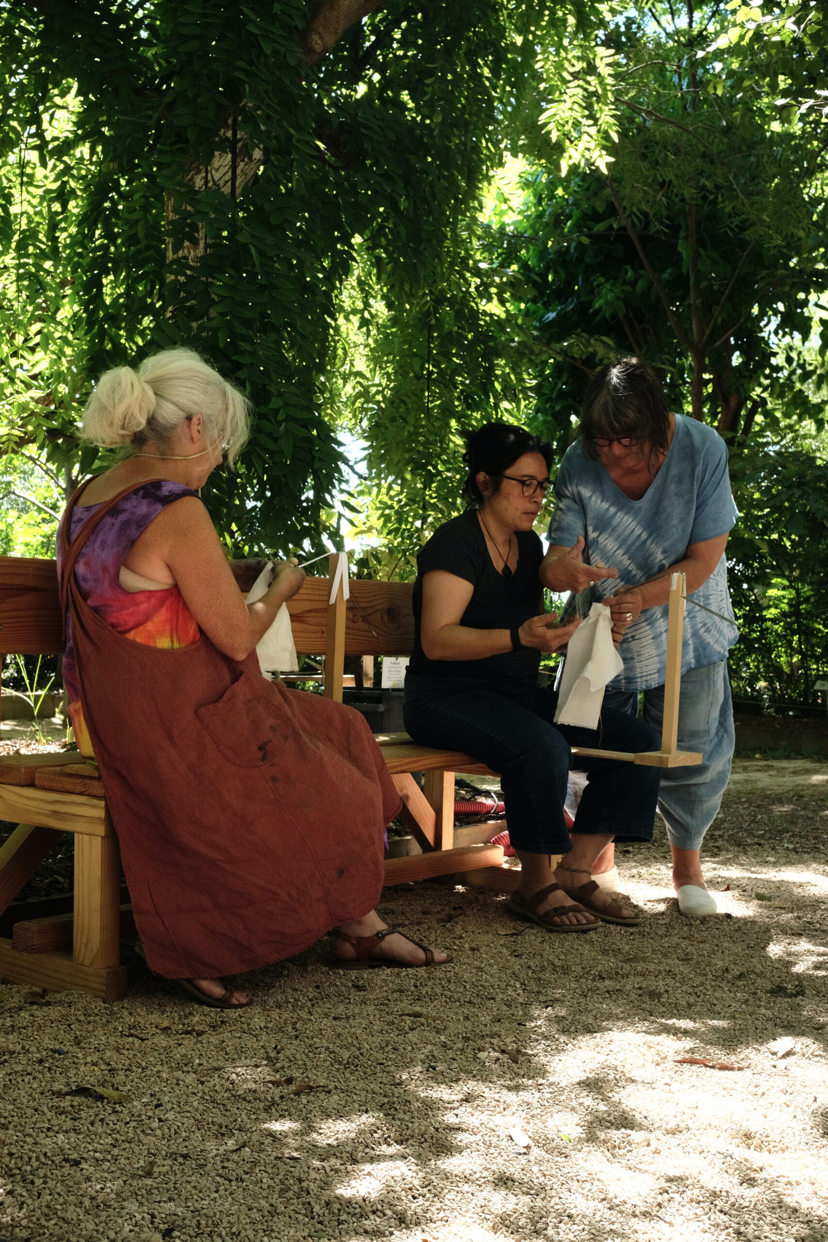 Les principales techniques employées utilisent des coutures (Nui Shibori), des ligatures (Arashi Shibori), des pliages comprimés entre plaquettes (Itajime Shibori). Nous expérimenterons aussi les outils spécifiques du shibori sur un métier spécialement conçu. La teinture se fera principalement en bleu dans une cuve d’indigo. La démarche proposée par cette technique et l’ensemble des procédés présentés sont écoresponsables et particulièrement respectueux de l’environnement.