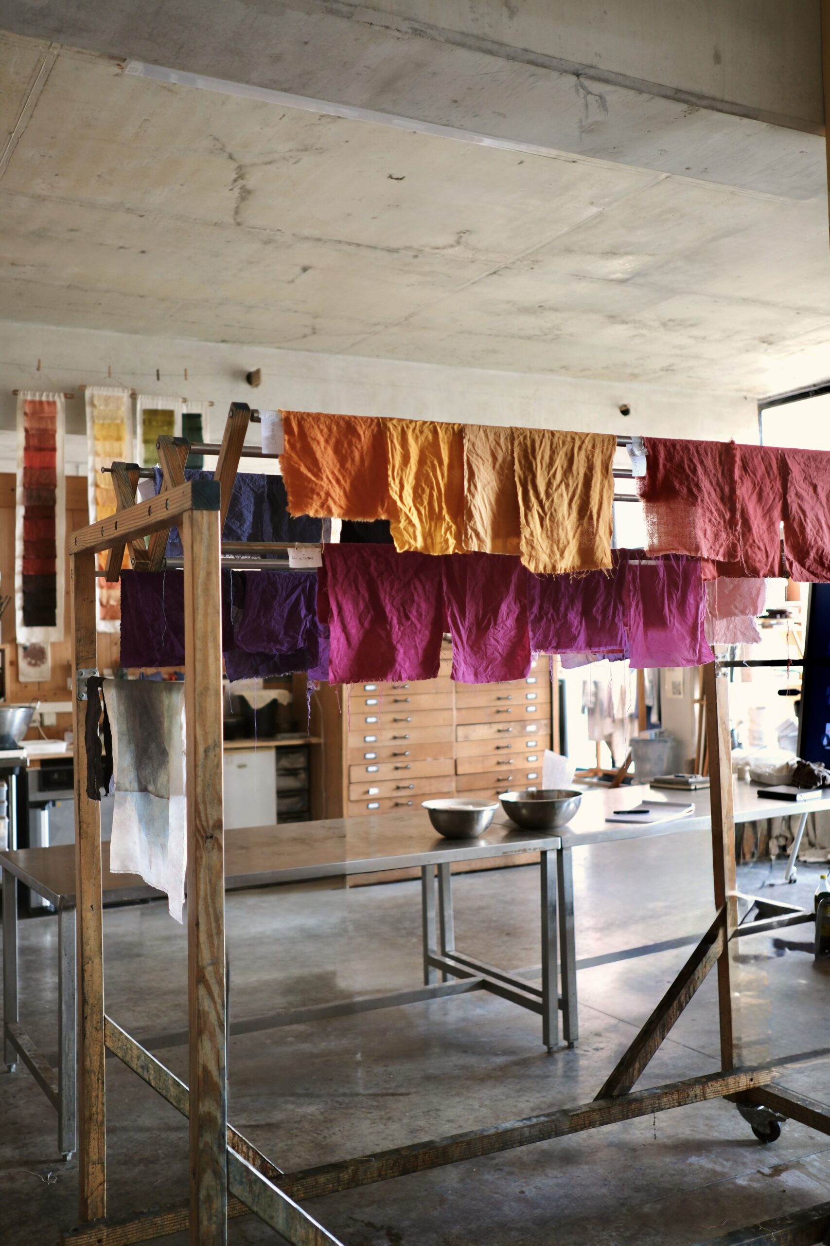 Couleur Garance propose un service artisanal de teinture naturelle sur mesure, incluant lavage, mordançage et teinture pour des créateurs, designer.euse.s ou marques.