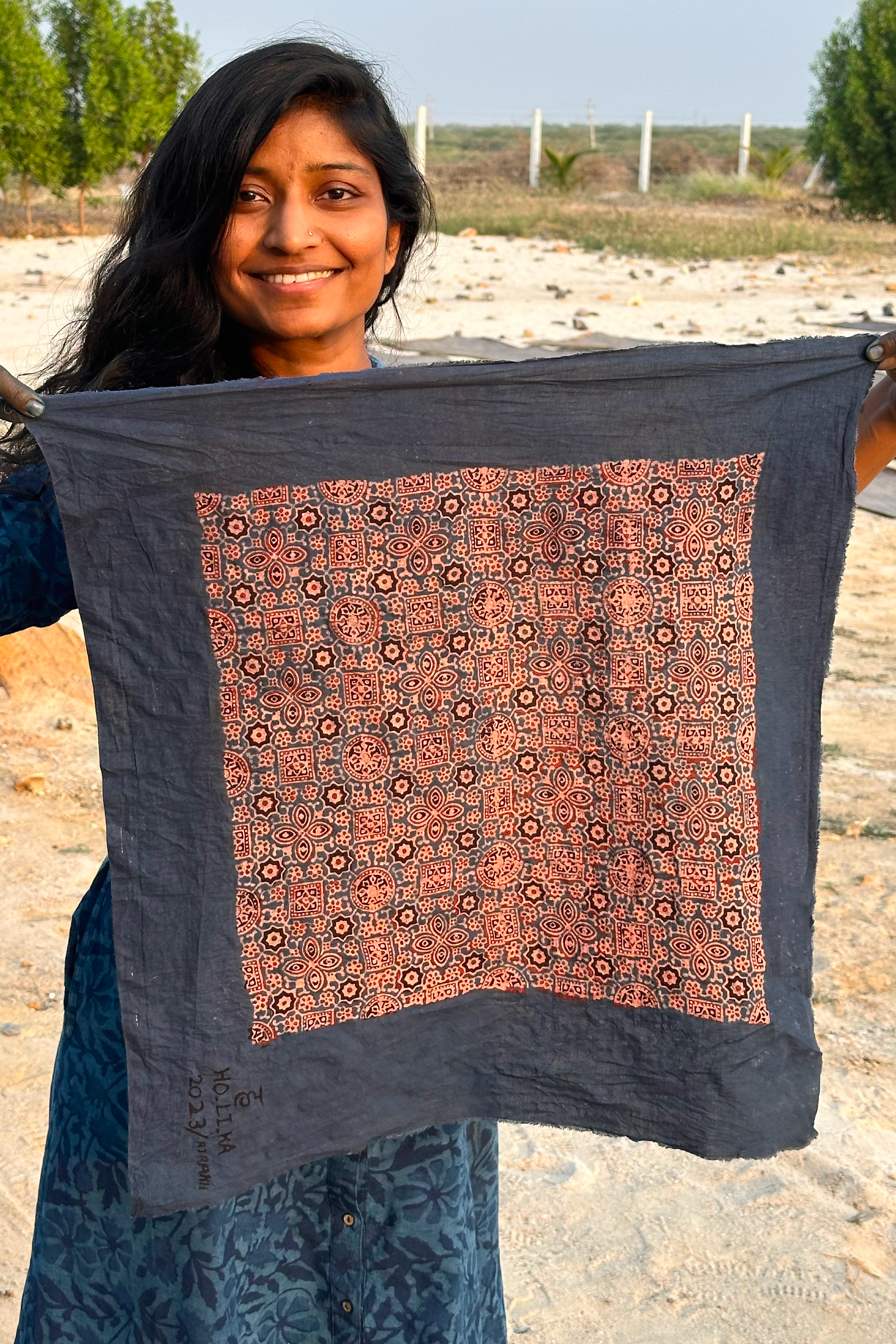 L’impression Ajrakh suit un processus exigeant de 16 à 20 étapes, chacune essentielle pour obtenir la richesse et la précision des motifs et des couleurs. Les participants apprendront à préparer des pigments naturels issus de ressources végétales et à maîtriser les techniques traditionnelles d’impression.