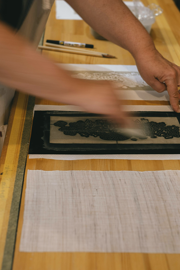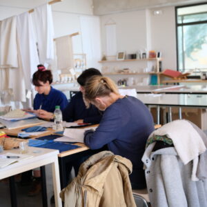 - Élaboration du motif et technique de réserve (Norizome) : réalisation de pochoirs en papier (Katagami) à partir de motifs issus de la culture japonaise (éléments floraux, animaux, formes géométriques). Ces pochoirs sont utilisés pour appliquer une pâte de réserve (Katanori), empêchant la pénétration de la teinture dans certaines zones du tissu. Le programme inclut la fabrication de cette pâte, sa mise en œuvre, ainsi que la préparation des textiles.