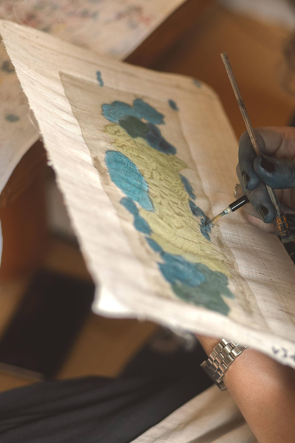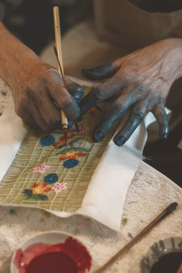 - Fabrication de pigments naturels : identification de plantes tinctoriales, extraction des composés colorants, transformation en pigments adaptés à l’usage textile. Ces pigments sont ensuite appliqués selon les procédés propres au Bingata.