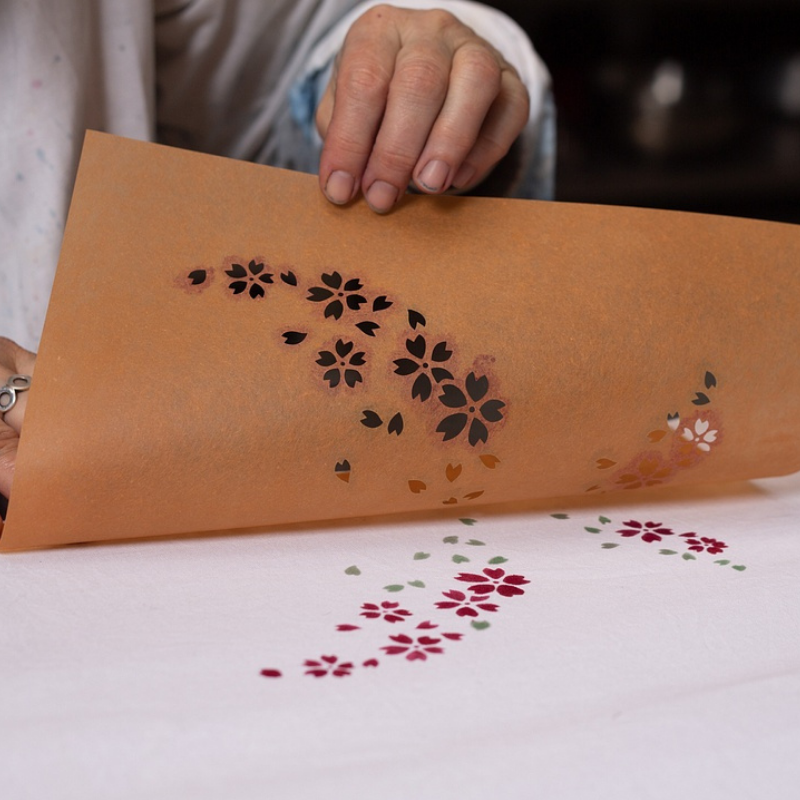 Le Katazome est une technique de motifs textiles réalisés au pochoir et à la pâte de réserve (Katanori).Les pochoirs utilisés sont appelés Katagami. En japonais, cela signifie “modèle en papier”.