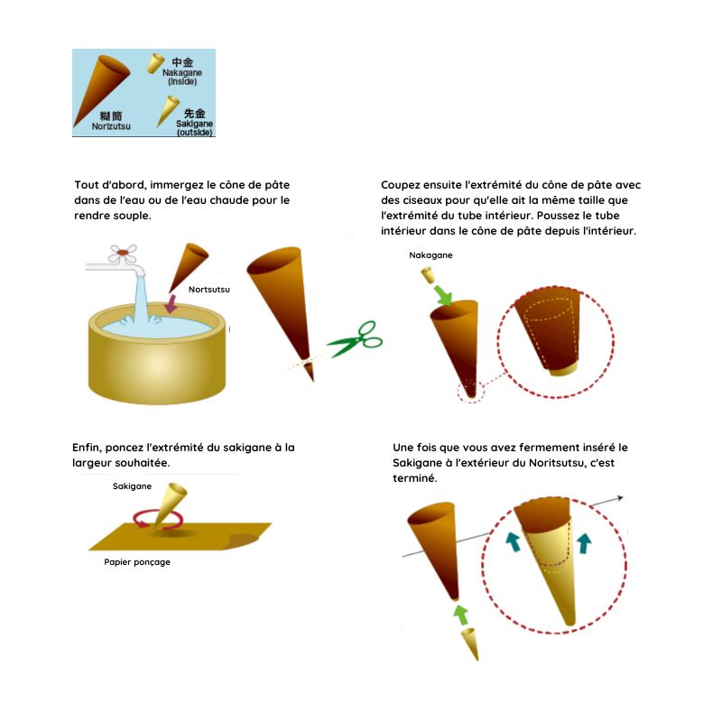 Dans le processus du Tsutsugaki, le nakagane est inséré à l’intérieur du noritsutsu, puis le sakigane (l’embout métallique) est fixé à l’extrémité. Ensemble, ces éléments permettent de guider la pâte katanori avec précision pour tracer les motifs sur le tissu, en contrôlant la quantité de pâte qui sort et la finesse des lignes dessinées.