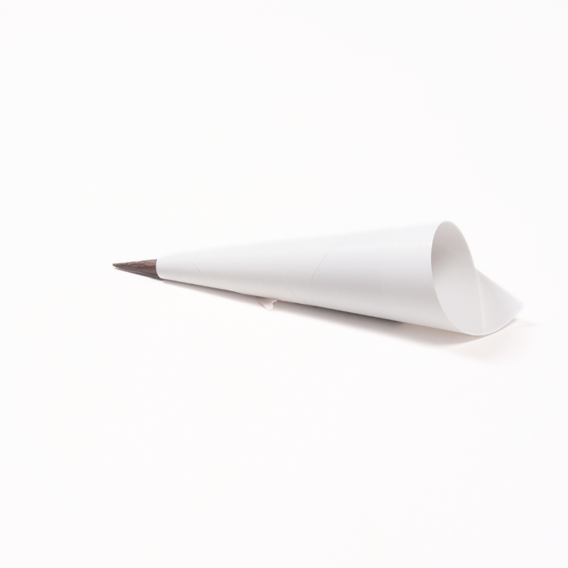 Le “Noritsutsu” est un cône en papier que l’on applique sur le bout du Papier triangle pour tsutsugaki, dans lequel on remplit la pâte katanori. Il est utilisé comme un stylo ou un pinceau pour appliquer la pâte katanori directement sur le tissu, permettant ainsi de dessiner des motifs détaillés. Une fois le dessin terminé et la pâte katanori séchée, le tissu est plongé dans une teinture. La pâte empêche la teinture d’atteindre les parties du tissu où elle a été appliquée, créant ainsi un motif en réserve.