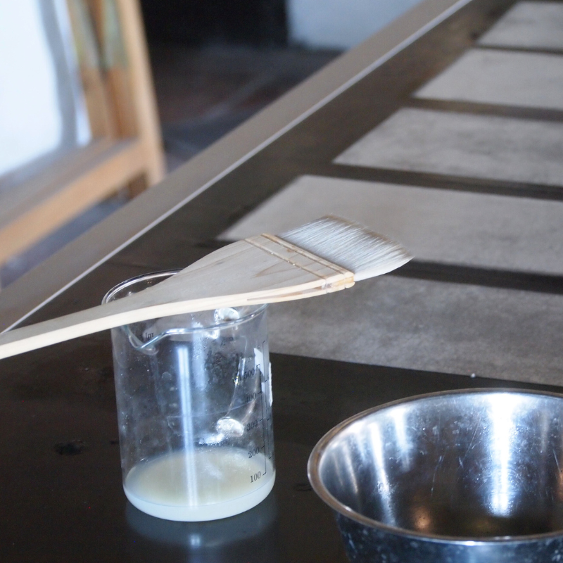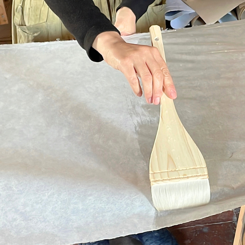 Idéal pour appliquer de la farine de konjac ou une solution de soja (Gojiru) sur le papier avant la teinture, il est également agréable à utiliser pour l’application d’encres, de kakishibu et d’autres solutions.