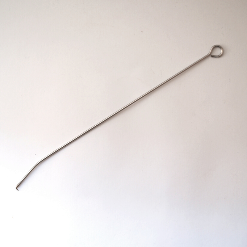 Cet outil japonais consiste en une fine tige d’acier terminée d’un côté par un anneau et de l’autre par un minuscule crochet. Il s’utilise attaché à une barre verticale par un lien souple. Il permet de créer les motifs de Te-kumo shibori, littéralement motif de toile d’araignée. Le centre du dessin est fixé au petit crochet. La première ligature part du bas du cône vers le haut puis redescend en grandes spirales, on «saute» d’un cône à l’autre en maintenant la tension. N’utilisant aucun nœud le motif est assez facile à défaire.