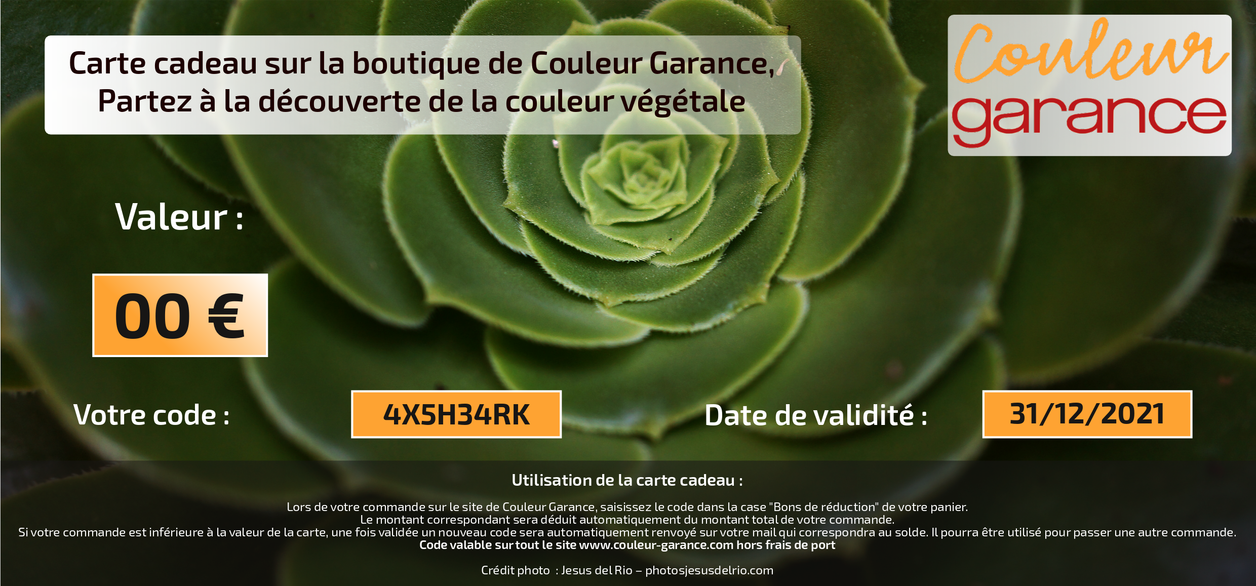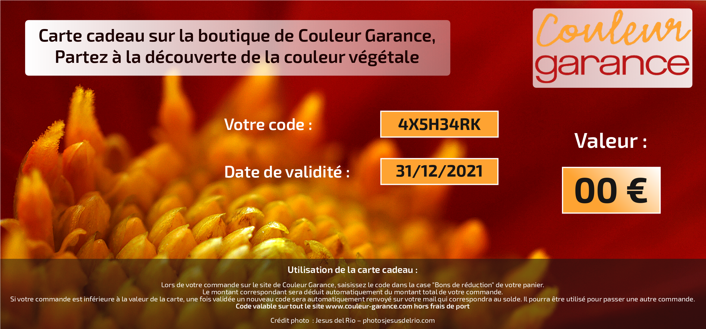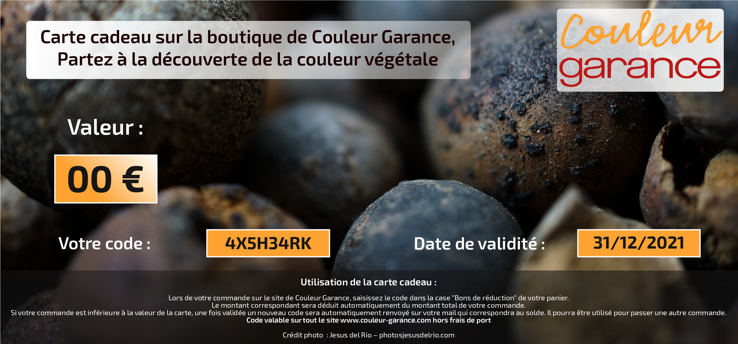 Elles peuvent être utilisées en une ou plusieurs fois à hauteur totale de leur montant, valable sur tout le site Internet www.couleur-garance.com, y compris sur les promotions, offres spéciales, soldes… pendant 1 an à compter de sa date d’émission.