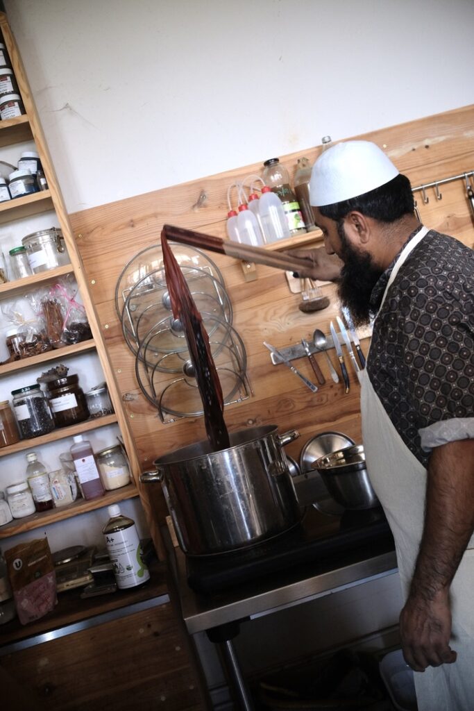 La semaine dernière, l’atelier a pris des airs d’imprimerie indienne. Entre les blocs de bois, les bains d’indigo et l’odeur des pâtes de réserve, on a accueilli Sufiyan Khatri et Parmett Tesson pour un workshop dédié à l’impression Ajrakh.