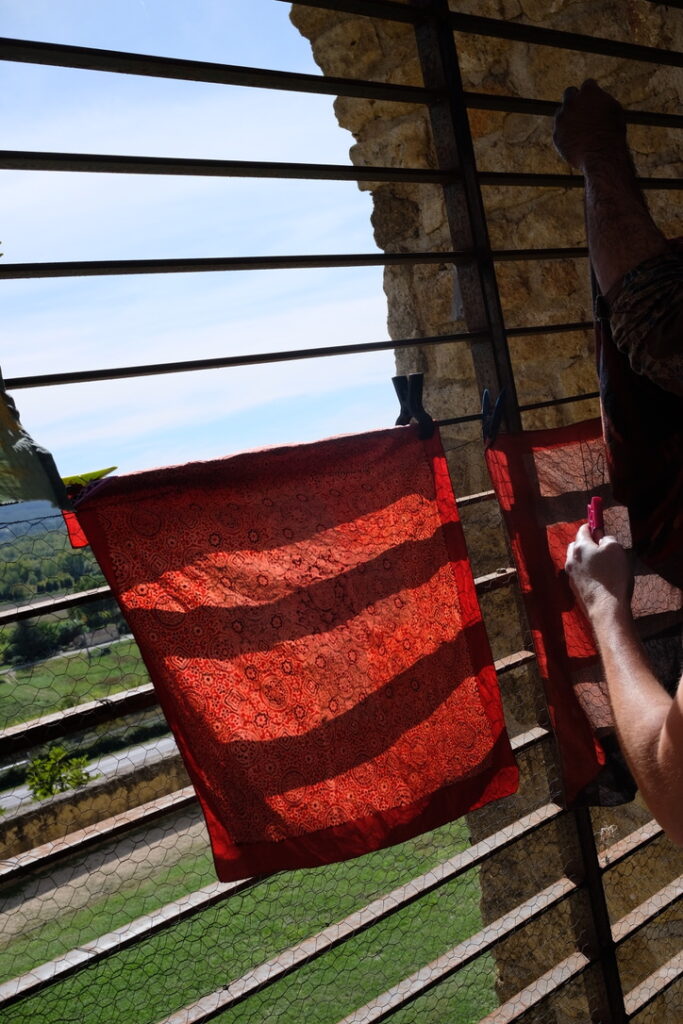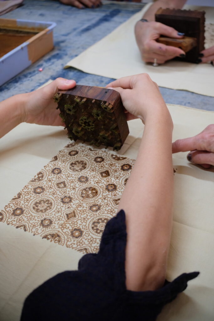 Pendant plusieurs jours, les gestes se sont répétés, précis, concentrés. Superposer les blocs. Aligner les motifs. Retourner le tissu. Imprimer à nouveau. Mais l’Ajrakh, ce n’est pas qu’une technique. C’est une manière de penser la couleur, de composer avec le temps. Les mordants, les bains, le fer, les réserves : chaque étape est une conversation silencieuse entre le tissu et la main.