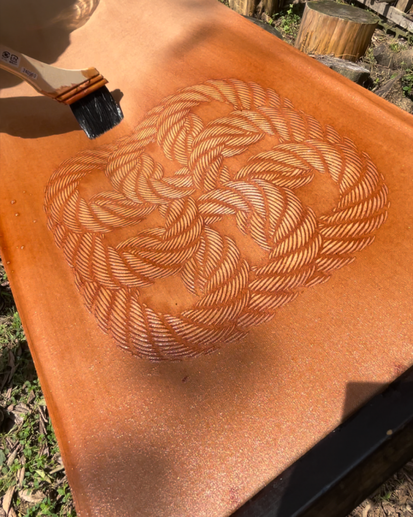 Sa teinte initiale, brun orangé, continue d’évoluer après application. Exposé à l’air et à la lumière, le kakishibu s’oxyde lentement et fonce, passant de tons miel à des bruns profonds. Cette transformation progressive fait partie intégrante de son esthétique : la couleur n’est jamais figée, elle accompagne la vie de l’objet.