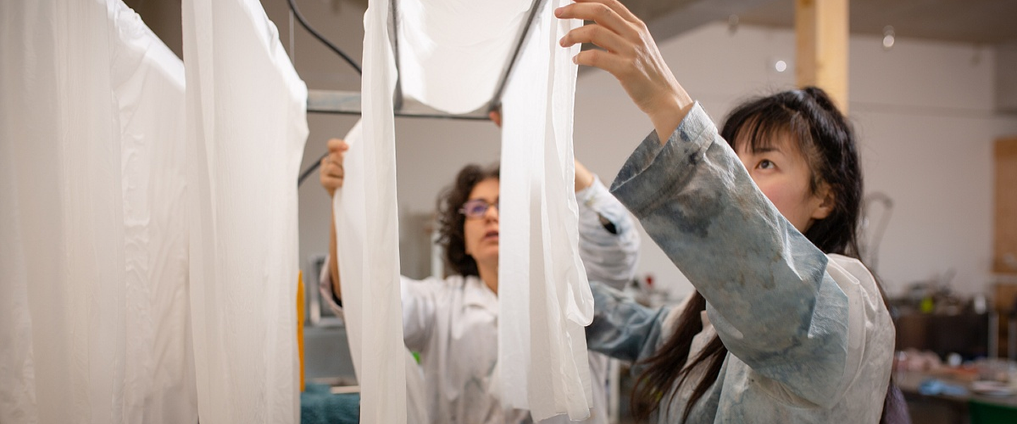 Nos recherches sont menées en collaboration avec un vaste réseau de professionnel·le·s – chimistes, agriculteur·rice·s, éleveur·euse·s et tisserand·e·s – pour développer des solutions innovantes et durables pour l’avenir du textile et du design.